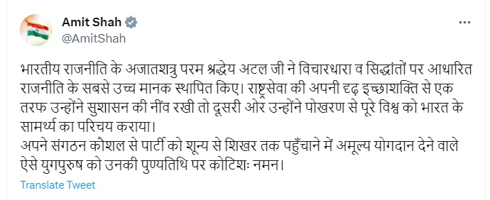 देश के गृह मंत्री अमित शाह ने उन्हें याद करते हुए अपने X (ट्विटर) हैंडल पर लिखा,"भारतीय राजनीति के अजातशत्रु परम श्रद्धेय अटल जी ने सिद्धांत एवं सिद्धांतों पर आधारित राजनीति के उच्चतम मानक स्थापित किये।"