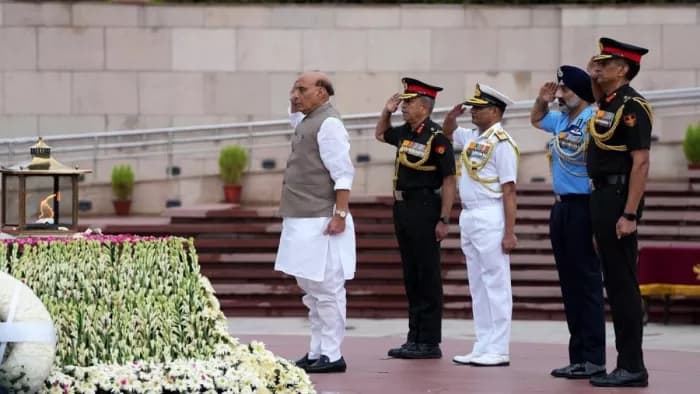 रक्षा मंत्री राजनाथ सिंह ने शुक्रवार को 25 साल पहले कारगिल युद्ध के दौरान राष्ट्र की भूमि की रक्षा के लिए अत्यंत कठिन परिस्थितियों में बहादुरी से लड़ने वाले सशस्त्र बलों के कर्मियों को श्रद्धांजलि अर्पित की।
