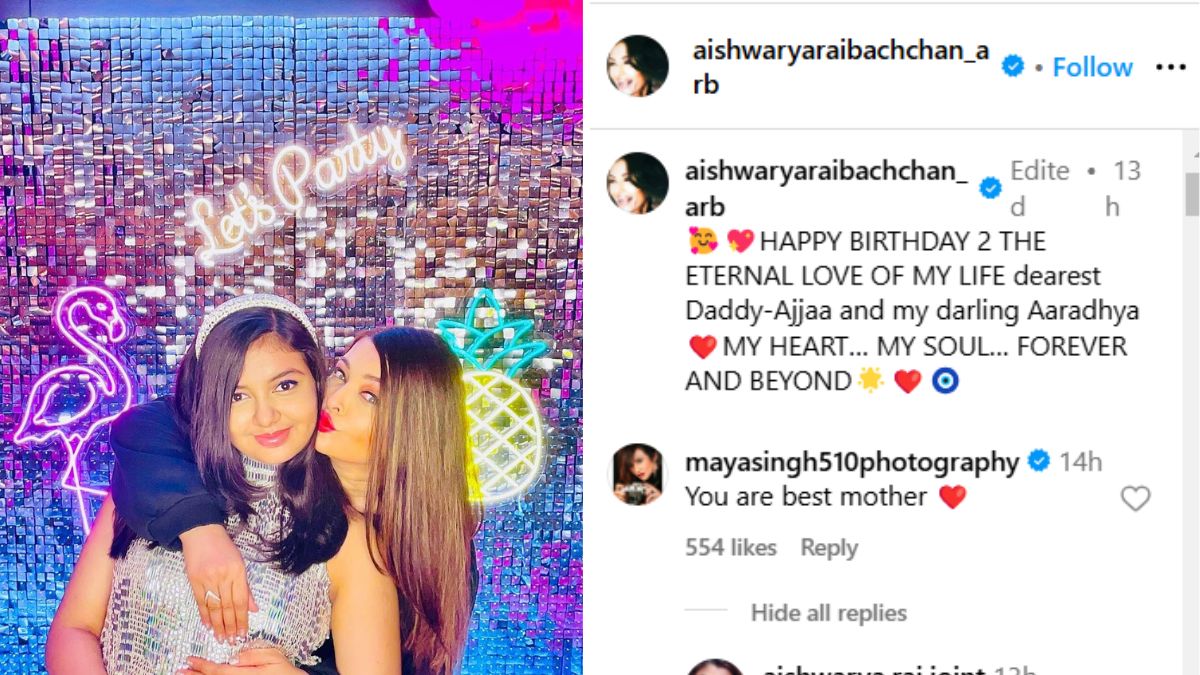 Photos Credit- Instagramइन तस्वीरों को देखने और ऐश्वर्या राय के कैप्शन को पढ़ने के बाद एक यूजर ने लिखा, "अमिताभ बच्चन और जूनियर बच्चन कोई भी फोटोज में नजर नहीं आ रहा है। अब लग रहा है तलाक की खबरें सच होने वाली है"। दूसरे यूजर ने लिखा, "बच्चन परिवार से आराध्या को किसी ने भी विश क्यों नहीं किया। क्या हो गया है इन्हें, क्या ये उनका अपना खून नहीं है"।