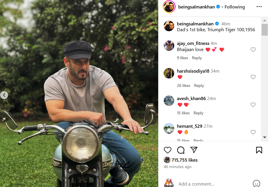 दबंग खान जहां खड़े हुए हैं, वहीं 88 साल के उनके पिता अपनी विंटेज बाइक ट्रंप टाइगर 100 पर बैठकर राइड का आनंद लेते हुए दिखाई दिए। वहीं दूसरी फोटो में सलमान खान ने अपने पिता की पहली बाइक पर बैठकर टशन में फोटो खिंचवाई। इस फोटो को शेयर करते हुए 'सिकंदर' एक्टर ने कैप्शन में लिखा, "पापा की पहली बाइक, ट्रंप टाइगर-100, जो उन्होंने 1956 में खरीदी थी"।