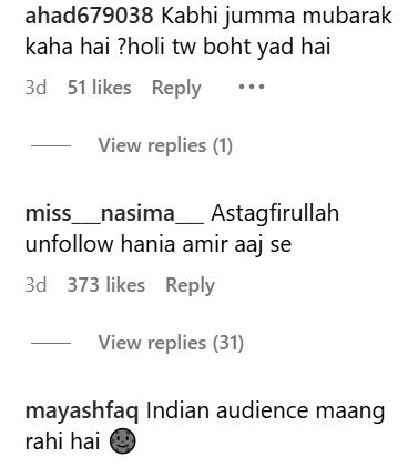 हानिया आमिर का यूं बिंदी लगाना और होली की शुभकामनाएं देना, कुछ यूजर्स को रास नहीं आया और वे सोशल मीडिया पर उन्हें बुरी तरह ट्रोल करने लगे। एक ने नाराज होकर पूछा, "रमजान में यह सब हानिया?" एक यूजर ने लिखा, "ये बिंदी लगानी जरूरी थी।" एक और ने कहा, "शैतान कैद हो गया, अपनी बाजी छोड़ गया।"