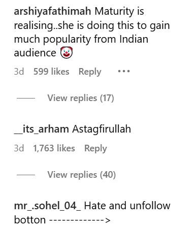 एक ने कहा, "मैच्योरिटी का एहसास हो रहा है। वह भारतीय ऑडियंस से ज्यादा लोकप्रियता हासिल करने के लिए ऐसा कर रही हैं।" एक यूजर ने लिखा, "कभी जुम्मा मुबारक कहा है? होली तो बहुत याद है।" एक ने कहा कि वह इंडियन ऑडियंस मांग रही हैं। इसी तरह कुछ लोग उन्हें बुरी तरह ट्रोल कर रहे हैं, जबकि कई फैंस ने उनका बचाव किया है।