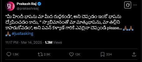 पवन कल्याण ने तमिलनाडु पर पाखंड करने का आरोप लगाया था और कहा था कि इसके नेता वित्तीय लाभ हासिल करने के लिए तमिल फिल्मों को हिंदी में डब करने की अनुमति दे देते हैं। अब हिंदी-तमिल भाषा के इस विवाद में प्रकाश राज भी कूद पड़े हैं। अभिनेता सामाजिक मुद्दों पर अपनी राय रखने से कभी पीछे नहीं हटते हैं।