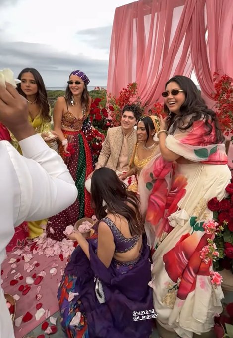 आलिया भट्ट अपनी गर्ल गैंग के साथ खास पल बिताने का कोई मौका नहीं छोड़तीं। कान्स में अपनी चमक बिखेरने के बाद वह सीधे स्पेन अपनी दोस्त तान्या की शादी में पहुंचीं। इस दौरान आलिया (Alia Bhatt wedding Spain) का स्टाइल देखते ही बन रहा था। उन्होंने मल्टी-कलर कलीदार लहंगे के साथ मस्टर्ड येलो ब्लाउज पहना, जिसे पर्पल बैंडाना और डार्क सनग्लासेस के साथ पेयर किया। उनका यह बोहो-चिक अंदाज हर किसी को पसंद आ रहा है। आलिया के साथ उनकी दोस्त आकांक्षा रंजन कपूर भी नजर आईं, जो पर्पल लहंगे में बेहद खूबसूरत लग रही थीं।
